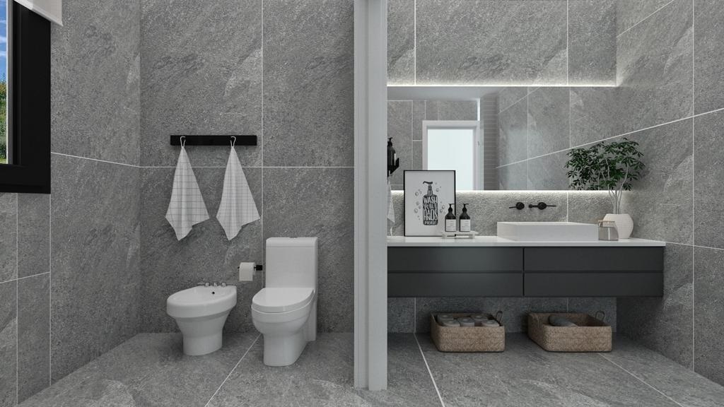 Planta baja: Los espacios sociales abiertos conectan la cocina, el comedor y el estar con una galería semicubierta que invita a compartir momentos al aire libre. También dispone de un ambiente versátil que puede funcionar como dormitorio de huéspedes o estudio, áreas de guardado estratégicamente ubicadas y un baño de servicio con acceso exterior.