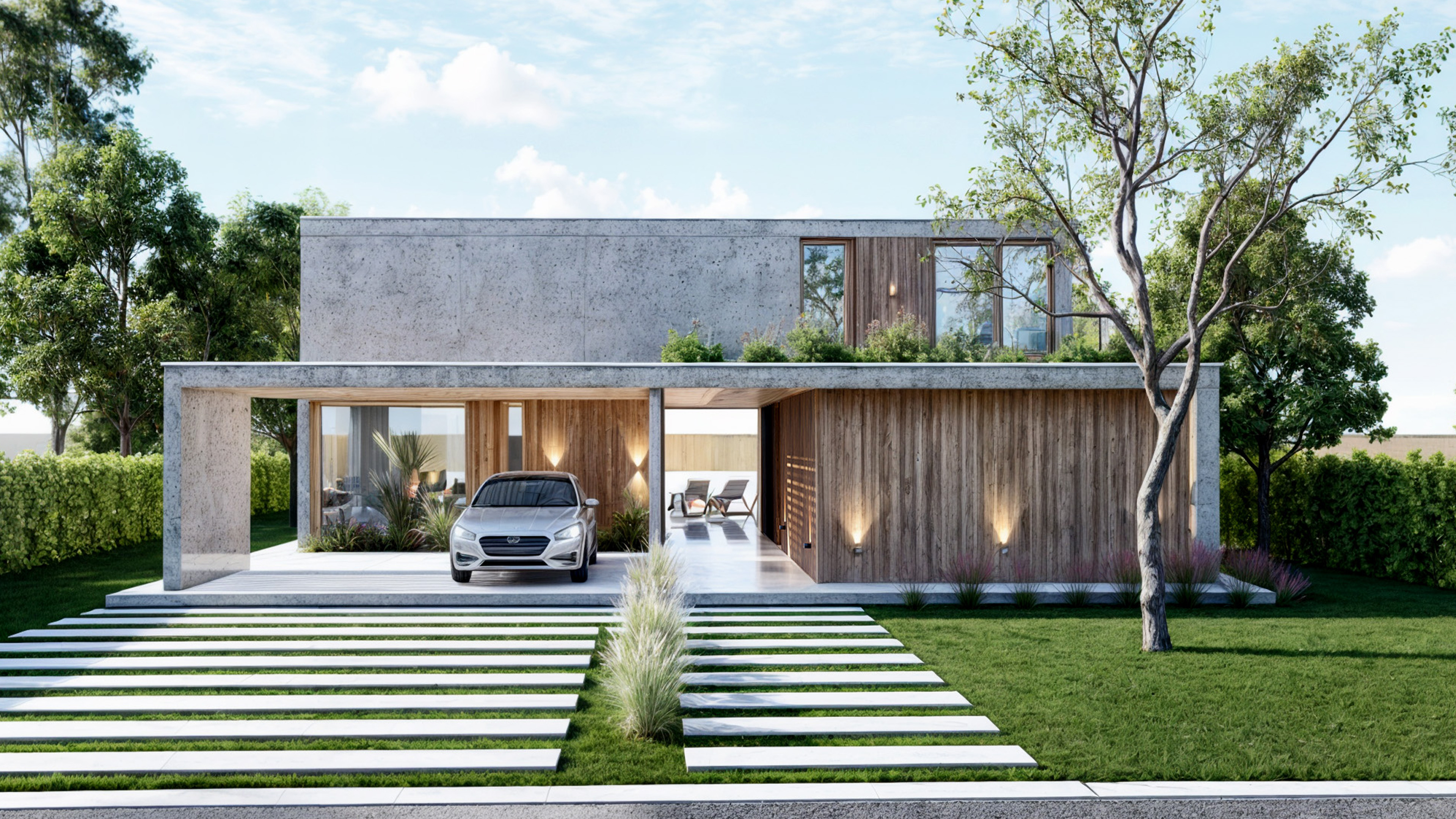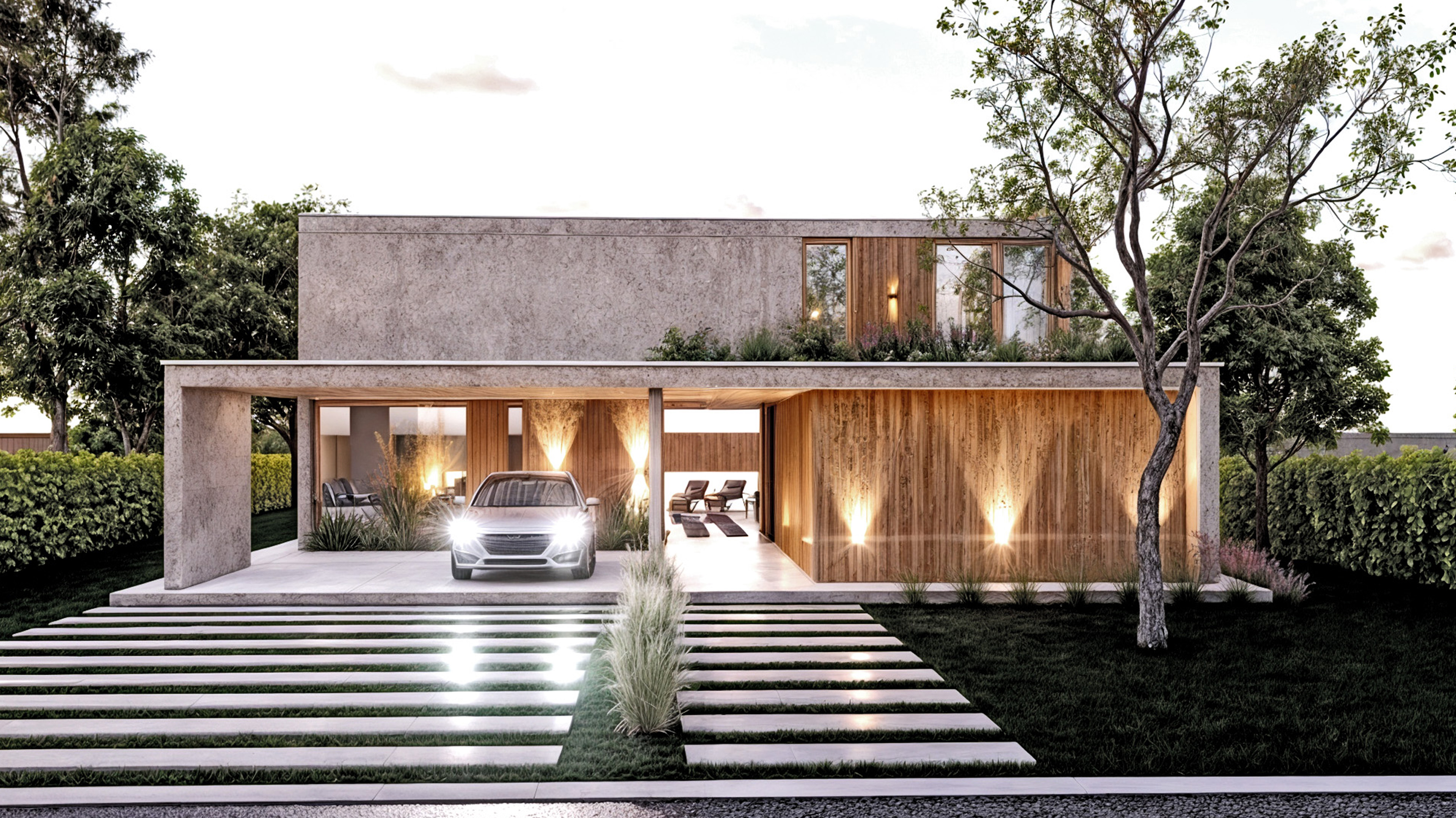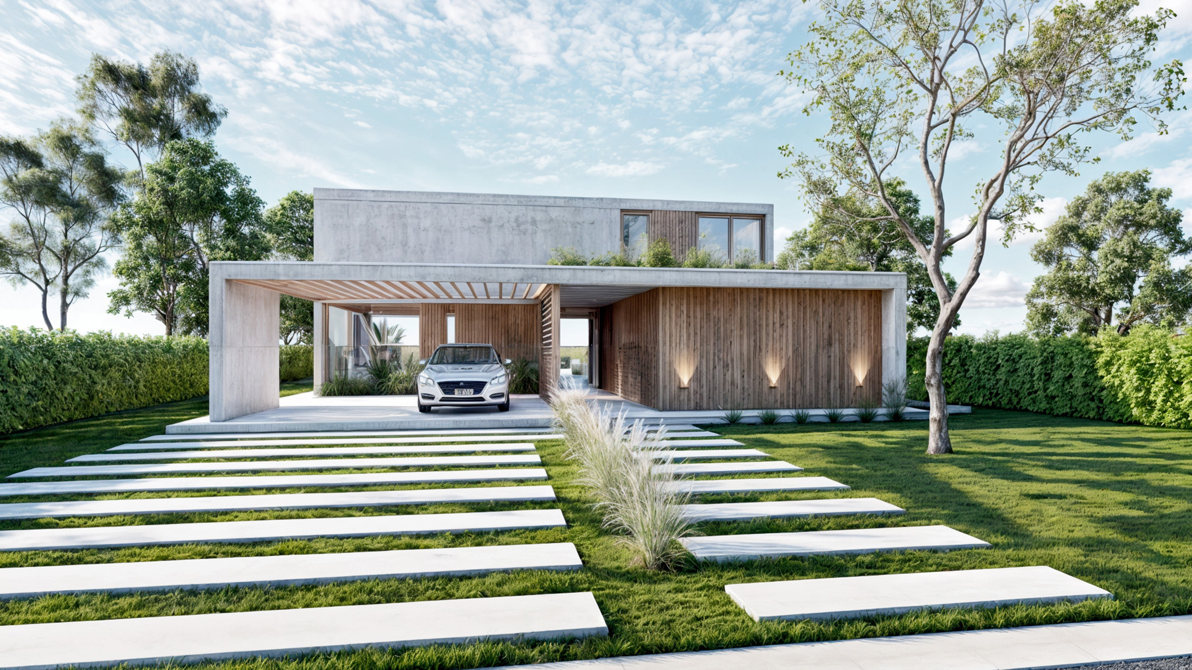 La materialidad juega un rol clave en la identidad de la casa: el hormigón visto define la estructura con una estética sobria y contemporánea, mientras que los detalles en madera aportan calidez y textura, equilibrando la contundencia del concreto. El diseño de líneas puras y volúmenes geométricos refuerza su carácter moderno, logrando una arquitectura atemporal y funcional.