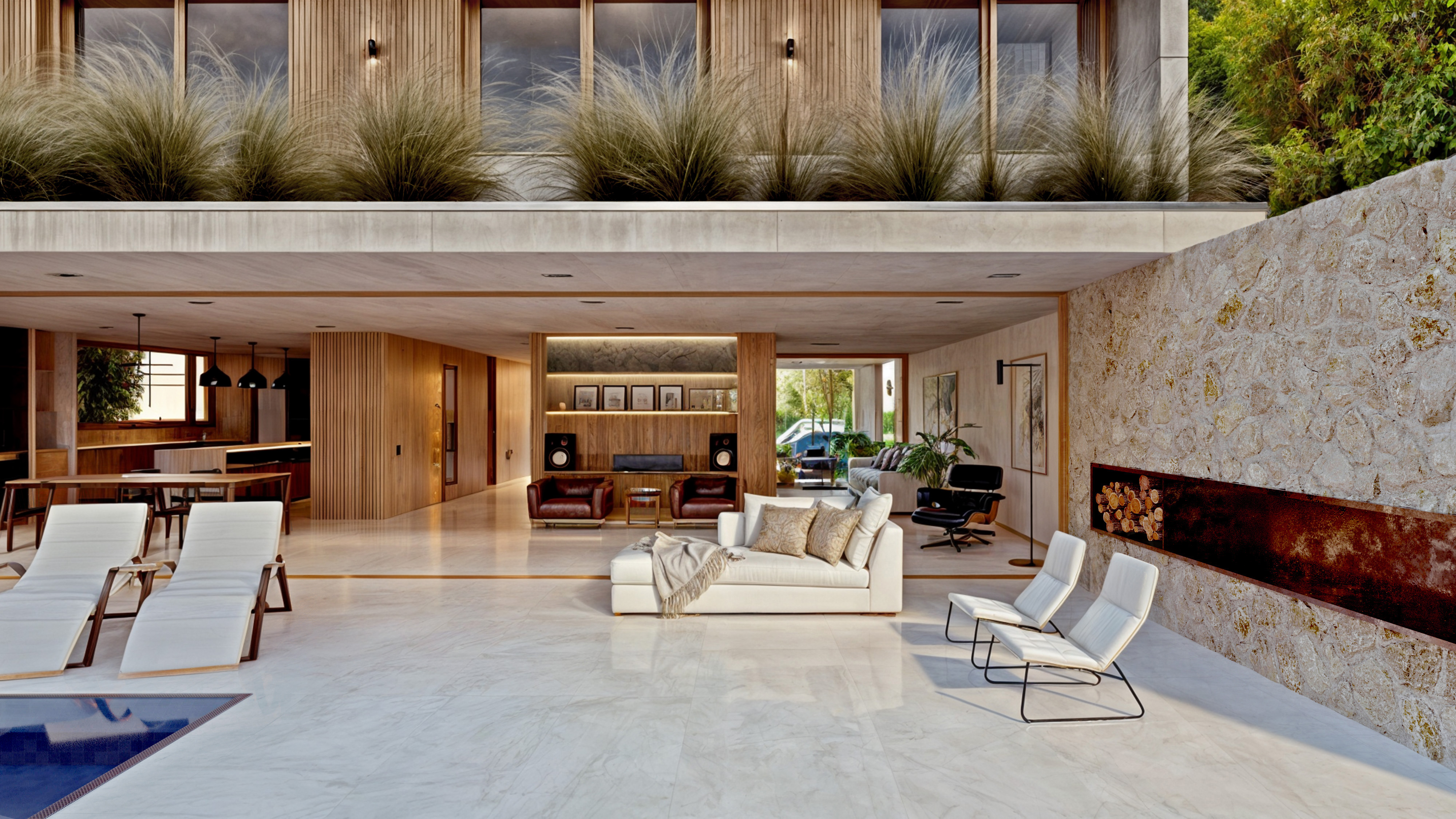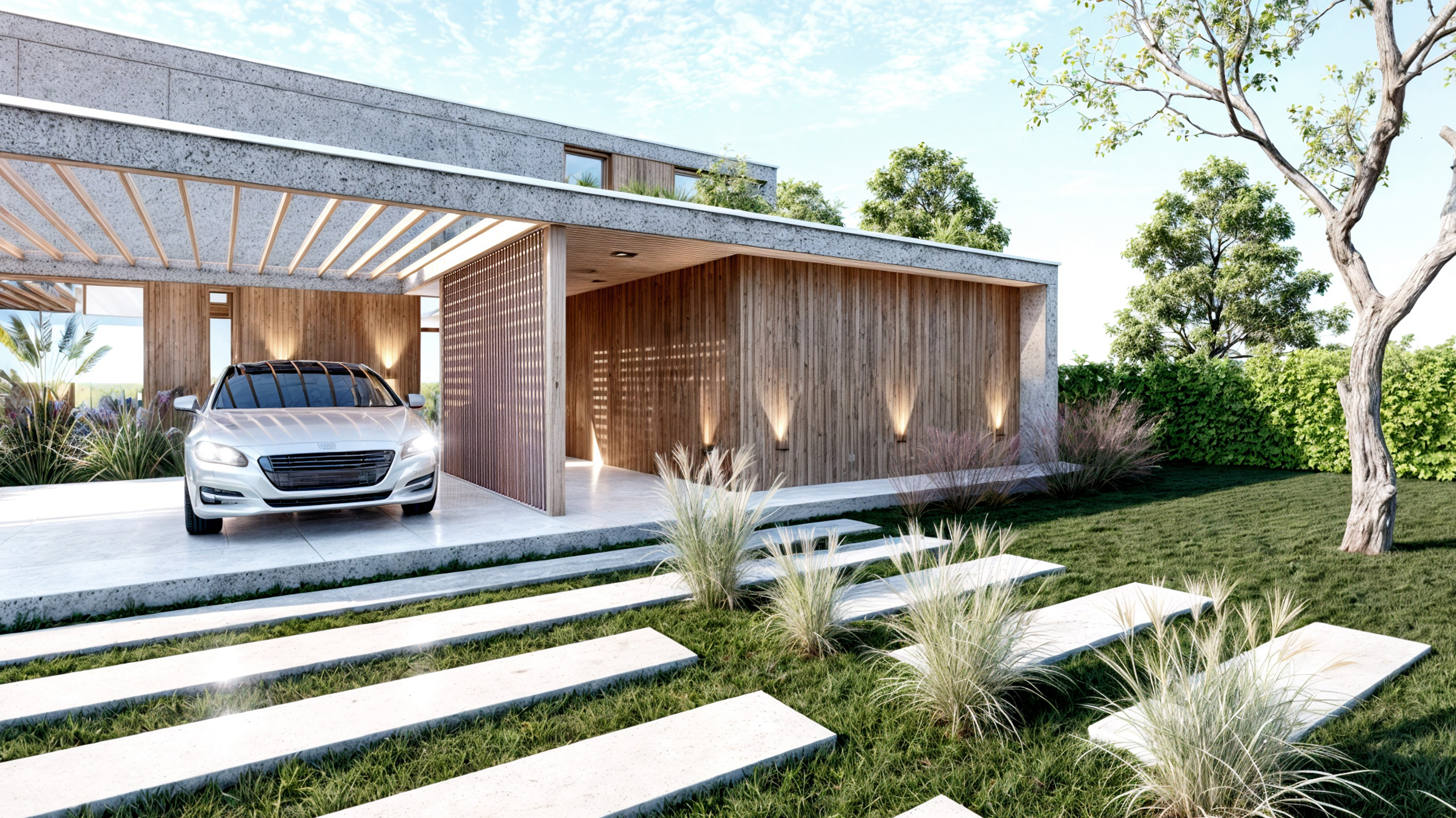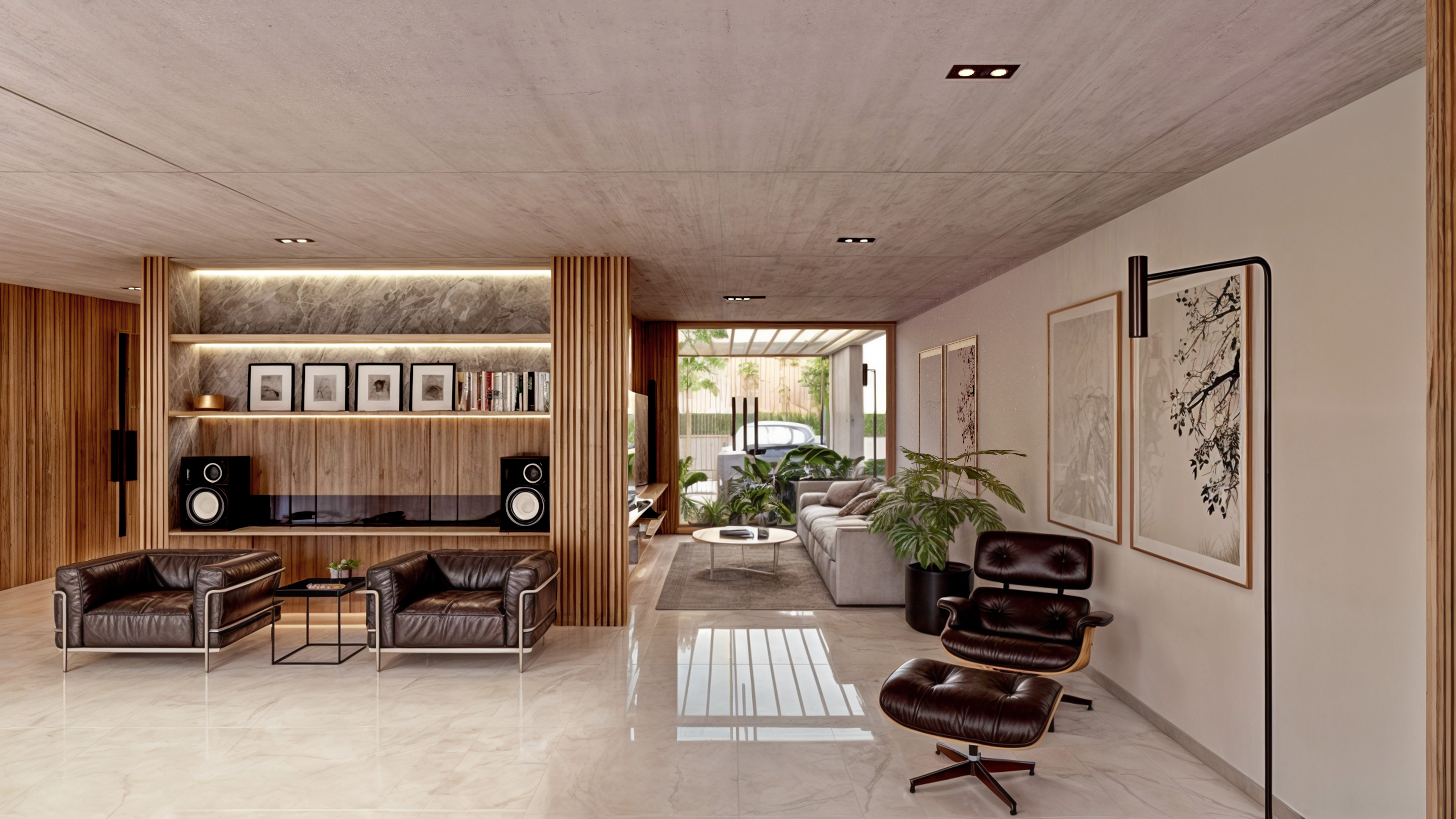 La materialidad juega un rol clave en la identidad de la casa: el hormigón visto define la estructura con una estética sobria y contemporánea, mientras que los detalles en madera aportan calidez y textura, equilibrando la contundencia del concreto. El diseño de líneas puras y volúmenes geométricos refuerza su carácter moderno, logrando una arquitectura atemporal y funcional.